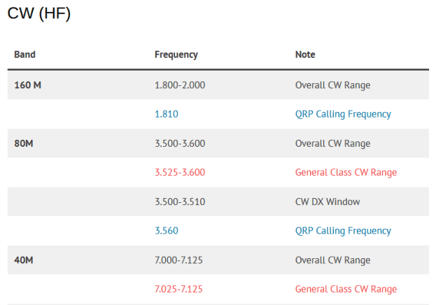 Because of this, I’ve created a page called, funny enough, “calling frequencies“. It is laid out in a way that makes most sense to me, and prevents me from having to locate the US Band Plan from ARRL, then the Considerate Operator’s Frequency Guide, and then ….