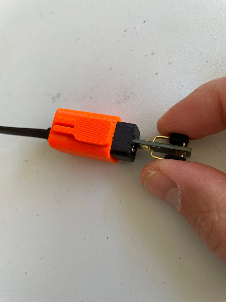 The assembled paddle consists of the paddle and audio port (one piece), a 3D printed holder body (black in the images), a 3D printed holder cover (orange in the images), and an adjustment tool that clips onto the holder cover.