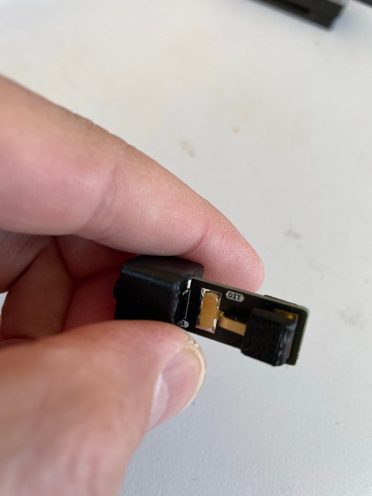 Removed from the holder cover. You can see the audio jack at the top left of the paddle body.Audio jack side of the paddleCloseup of the working end of the paddle. Note that each side is labeled “DIT” and “DAH” so that you can quickly ensure that you’re holding it right.I would say that I have average sized hands for an adult male, so you can see how the paddles are quite small compared to my finger and thumb.