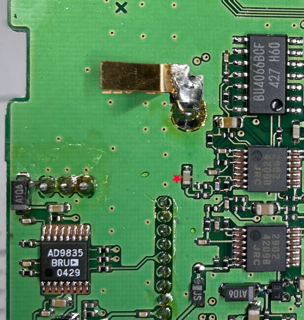 C1338 is a SMD capacitor that needs to be removed so that we can use the connection points to add more wiring. They recommend quickly alternating with a soldering iron between the two solder points until it can be easily removed.