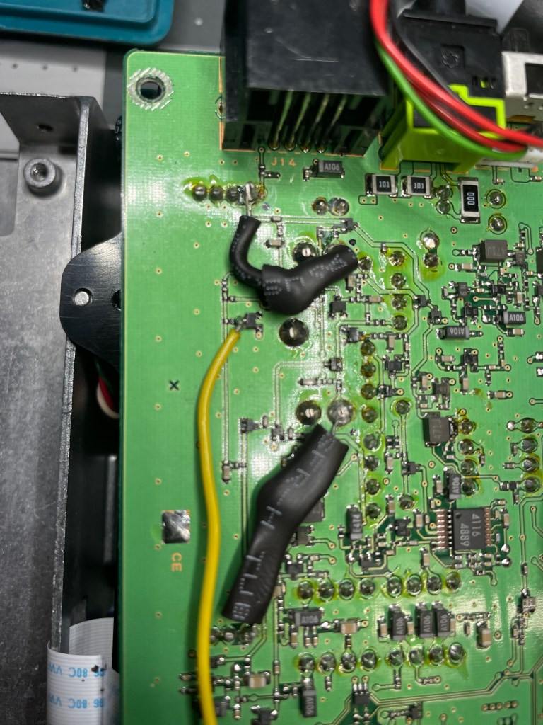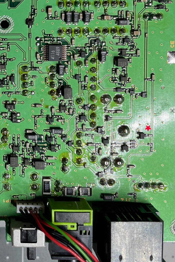 Then a yellow switching wire is soldered to the collector of Q1083 (red star below and shown in an earlier photo). This is a really small connection so take your time and use a lot of care. There is what looks like a SMD resistor right next to it – a very fine tip on your soldering iron is needed here. That and a magnifying glass (for me at least).