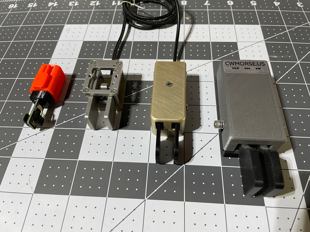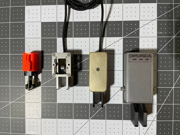 (left to right) N6ARA TinyPaddle, N0SA SOTA Paddle, American Morse Ultra Porta Paddle, and the CW Morse Lightweight Double Paddle. Note that each square grid is 1″ x 1″ (25.4mm x 25.4mm).